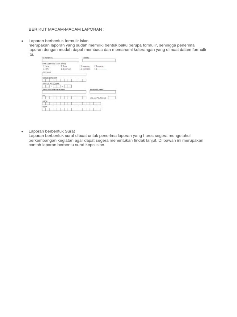 Laporan mempunyai peranan yang penting pada suatu organisasi karena dalam suatu. Inilah contoh laporan berbentuk surat. Pembuatan laporan cukup mengisi data sesuai dengan tuntutan formulir. Laporan ini bisa panjang atau pendek.
