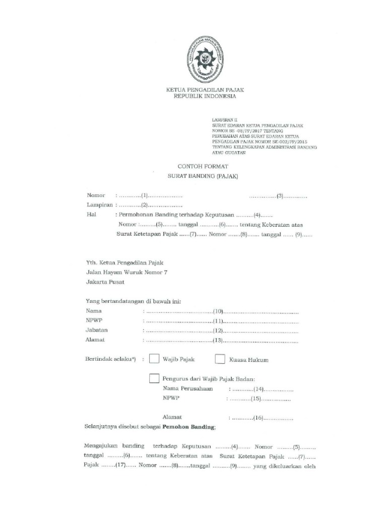 07092017 surat edaran ketua pengadilan pajak nomor se 05pp2017. Surat edaran ketua pengadilan pajak tentang perubahan atas se 002pp2015 tentang kelengkapan administrasi banding dan gugatan. Permohonan banding kami mengajukan banding atas surat. A wajib pajak dapat mengajukan permohonan banding hanya kepada badan peradilan pajak terhadap suatu keputusan keberatan yang ditetapkan oleh dirjen pajak. Pt abc menyampaikan spt badan 30 april 2012 pihak fiskus melakukan pemeriksaan dan menerbitkan surat ketetapan pajak kurang bayar skpkb pt abc pada tanggal 03 desember menindak lanjuti dengan mengajukan keberatan kemudian banding serta permohonan pk. Contoh surat kuasa pajak orang pribadi kenapa surat kuasa penting.