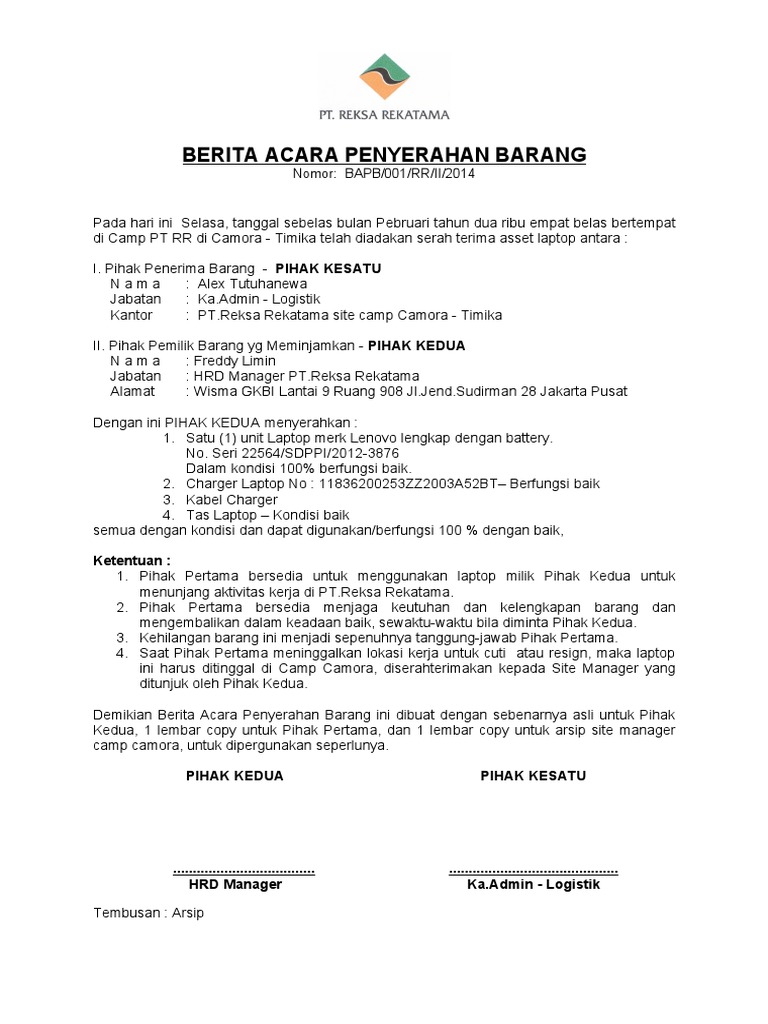 Contoh surat berita acara serah terima barang. Nah kali ini admin ingin berbagi ilmu tentang pembuatan suratberita acara serah terima barang. Alangkah baiknya apabila surat ini secepatnya diberikan bubuhan tanda tangan ketika sedang prosesi penyerahan suatu barang oleh satu pihak tertuju pihak yang lain. Berita acara serah terima barang adalah salah satu dokumen penyerahan barang yang sangat penting. Contoh berita acara serah terima pekerjaan. Berita acara serah terima barang merupakan termasuk dokumen penyerahan barang yang amat krusial.