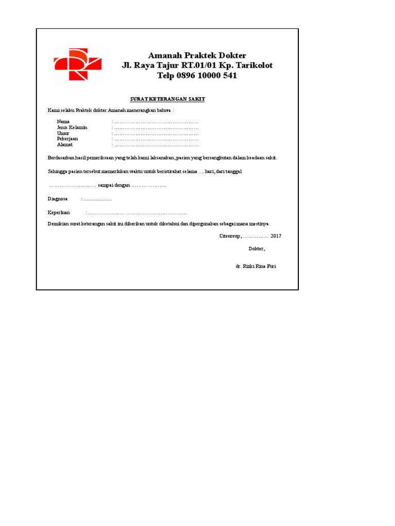 Contoh surat keterangan dokter dan diagnosa penyakit. Surat ini diperlukan untuk memberitahukan kondisi kesehatan yang sedang dialami oleh seseorang dengan harapan mendapatkan izin tidak masuk kerja karena sakit. Contoh surat sakit akibat diagnosa penyakit. Surat keterangan sakit merupakan sebuah surat yang ditujukan kepada sebuah instansi baik sekolah kantor rumah sakit sebagai suatu keterangan bahwa kita tidak dapat melakukan aktivitas seperti biasanya. Surat keterangan sakit pada umumnya hanya mencantumkan bahwa seseorang tersebut sehat. Hal ini untuk mencegah penyakit tersebut semakin parah.