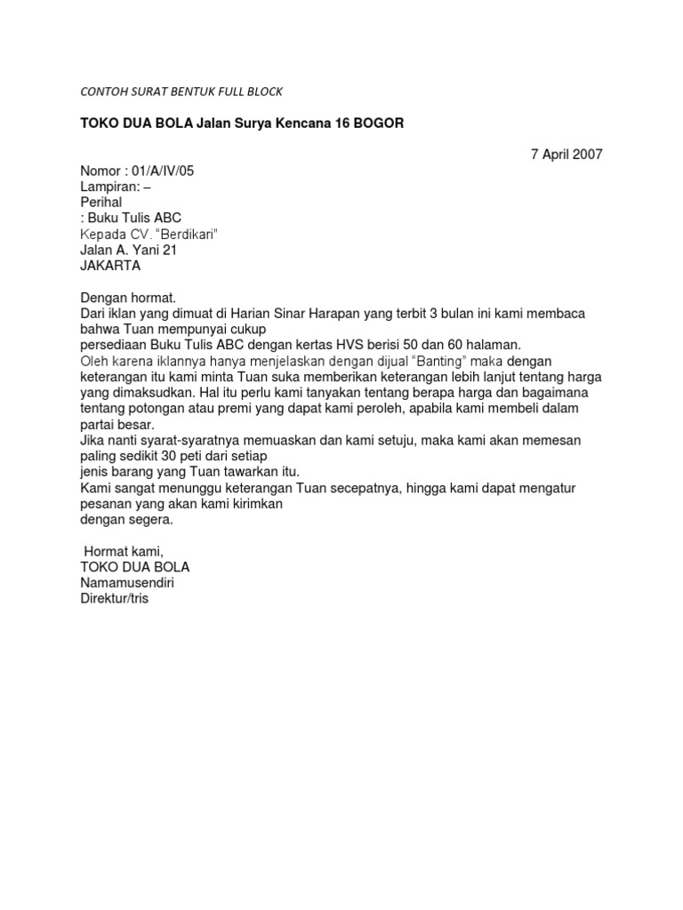 Contoh surat full block. Surat yang juga disebut sebagai surat bentuk lurus ini merupakan kombinasi dari bentuk surat full block style dan semi block style. Download gratis contoh surat full block style surat ialah alat komunikasi antara seseorang dengan seseorang yang di kehendakinya yang berisi artikel pernyataan suatu kabar kemauan dan respon yang layak dengan keinginan dari penulis surat hal yang demikian. Setiap bentuk surat memiliki polanya sendiri dan di sini ada lima macam bentuk surat yang bisa diterapkan pada surat lamaran kerja. Setiap bentuk surat memiliki polanya sendiri dan di sini ada lima macam bentuk surat yang bisa diterapkan. Contoh surat block style dalam ilmu administrasi perkantoran surat block style adalah salah satu jenis surat yang dibedakan berdasarkan bentuknya. Sebagaimana yang sudah dibeberkan diatas bahwa penggunaan bahasa.