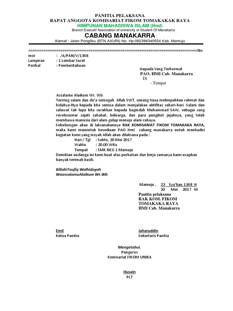 0 0 a hmi koms ii 1438. Berikut ini contoh surat yang baik dan benar serta menarik perhatian yang dapat anda gunakan dalam tema maupun format penulisan surat. Untuk mengikuti musyawarah komisariat ke vi himpunan mahasiswa islam koordinator komisariat sultan agung cabang semarang periode 1437 1438 h 2016 2017 yang insya allah dilaksanakan pada. Berpartisipasi pada kegiatan hmi cabang serang. Sehubungan dengan diadakannya acara rapat anggota komisariat rak xxii hmi cabang surakarta komisariat fakultas hukum uns maka dengan ini kami memberitahukan bahwa acara tersebut insya allah akan diadakan pada. Berikut adalah rencana kerja ketua umum hmi komisariat fasei iain smh banten periode 2014 2015 ketika pertama kali di lantik.