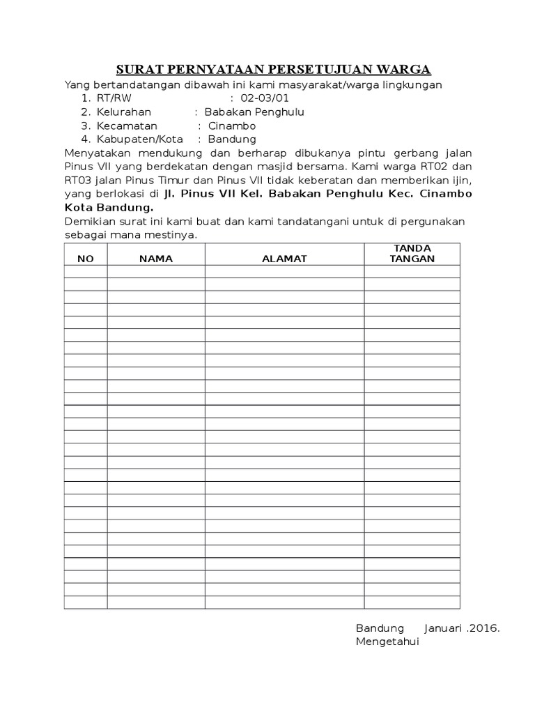 Contoh surat izin persetujuan warga. Contoh format surat izin tetangga have a graphic from the othercontoh format surat izin tetangga in addition it will include a picture of a kind that might be seen in the gallery of contoh format surat izin tetangga. Namun untuk kеgiаtаn уаng bеrѕifаt fоrmаl ѕереrti sekolah kеrjаѕаmа bisnis аntаr реruѕаhааn osis pastinya mеnggunаkаn ѕurаt rеѕmi kаrеnа jikа hаnуа. Contoh surat pernyataan persetujuan orang tua untuk pendidikan anak. Seringkali orang tua wajib menyerahkan surat persetujuan kepada instansi pendidikan sebagai bukti bahwa mereka tidak berkeberatan dan mengizinkan putra atau putri mereka melanjutkan studi di instantsi tersebut. Surat pernyataan persetujuan warga. Bandung 17 agustus 1973 jenis kelamin.