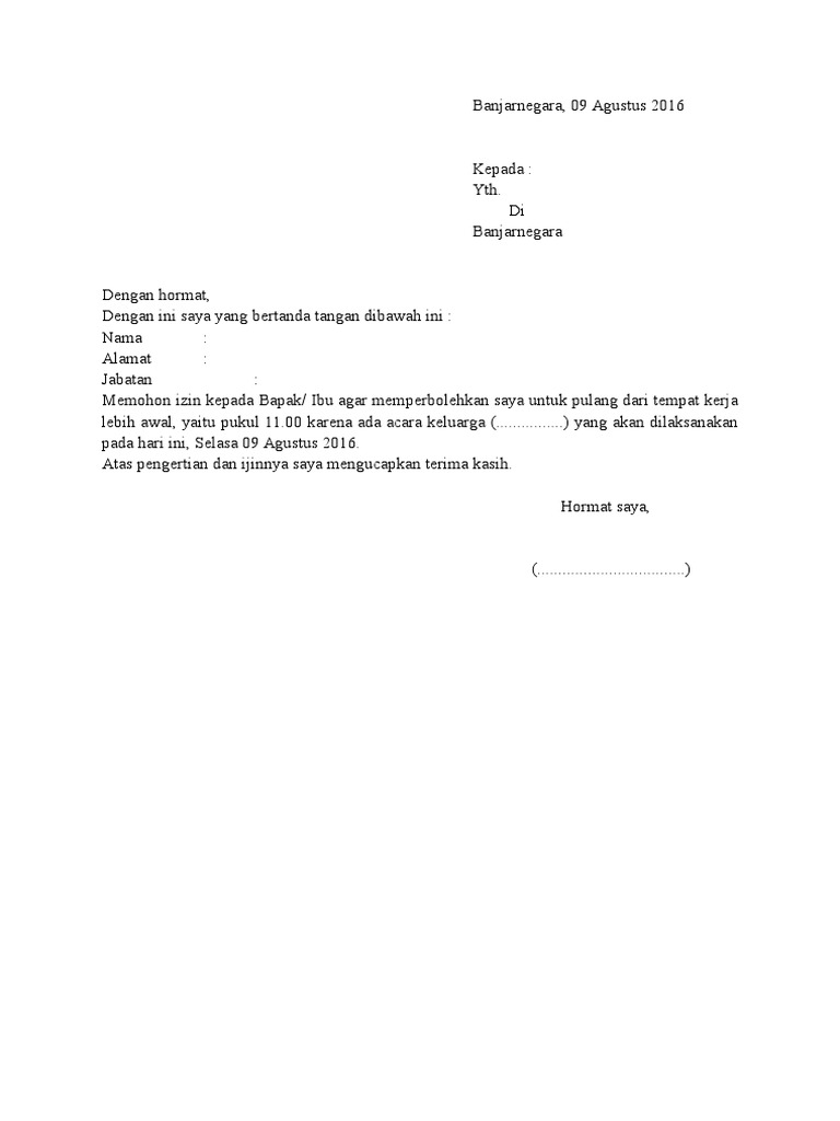 Contoh surat izin pulang lebih awal. Admin blog bagikan contoh 2019 juga mengumpulkan gambar gambar lainnya terkait contoh surat izin pulang sekolah lebih awal dibawah ini. Baik itu surat yang dipergunakan oleh perusahaan instansi pemerintahan lembaga organisasi dan perseorangan. 99 contoh surat pengumuman cara membuat dan jenis jenisnya. Contoh surat lengkap surat ijin surat lamaran kerja perintah resmi permohonan keterangan undangan dinas niaga jalan dukungan pengantar. Posted by unknown on 2220 banjarmasin. Related posts to contoh surat izin pulang lebih awal dari sekolah contoh surat izin pulang lebih awal dari sekolah 2017 12 04t083300 0800 rating.