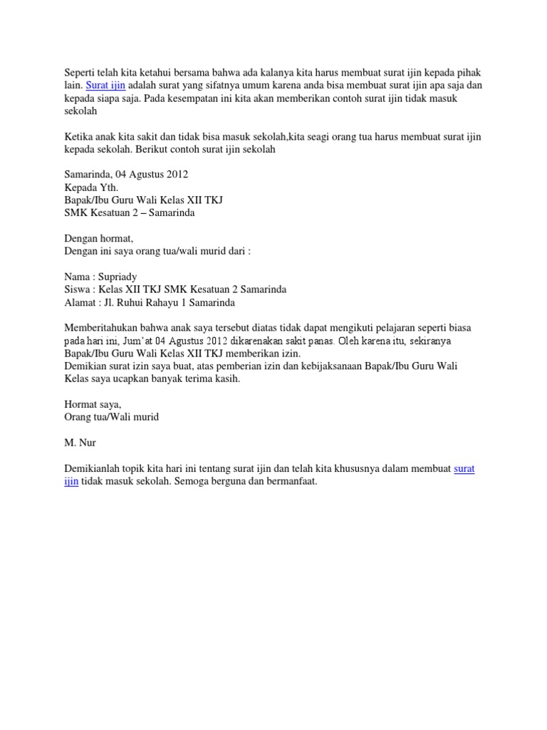 Surat izin tidak masuk sekolah mempunyai tujuan untuk memberitahukan kepada pihak sekolah bahwa siswa yang tercantum namanya di surat tersebut berhalangan hadir untuk belajar di sekolah. Meskipun surat ini masih tergolong sebagai surat pribadi dalam penulisan surat izin sekolah ini berbeda saat kita menulis sebuah surat untuk teman kita. Seperti halnya acara keperluan mendadak pribadi dinas maupun masalah internal diri yang akan secara cepat tanpa ada planning sebelumnya yaitu sakit. Contoh surat izin sakit sekolah dari wali atau bapakibu kost surat izin sakit mungkin ada di antara kamu sekalian yang menempuh pendidikan di luar kota dan jauh dari orang tua. Surat izin adalah surat yang berisi keterangan seseorang meminta izin kepada sekolah universitas tempat kerja dan lain lain karena suatu keperluan yag tidak bisa ditinggalkan contoh seperti sakit lomba dan kegiatan lainnya. Surat rasmi memohon cuti sekolah ini penting untuk memastikan rekod berhenti sekolah kelak pelajar yang baik dan tiada mempunyai rekod kesalahan.
