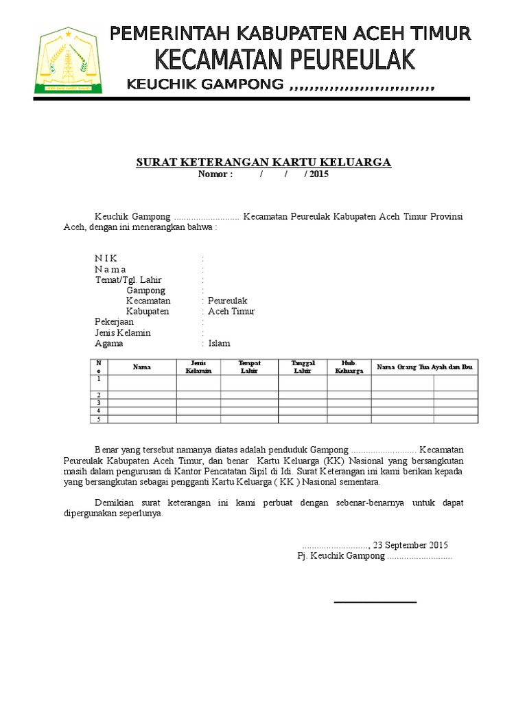 Format Terbaru Surat Keterangan Kartu Keluarga Dalam