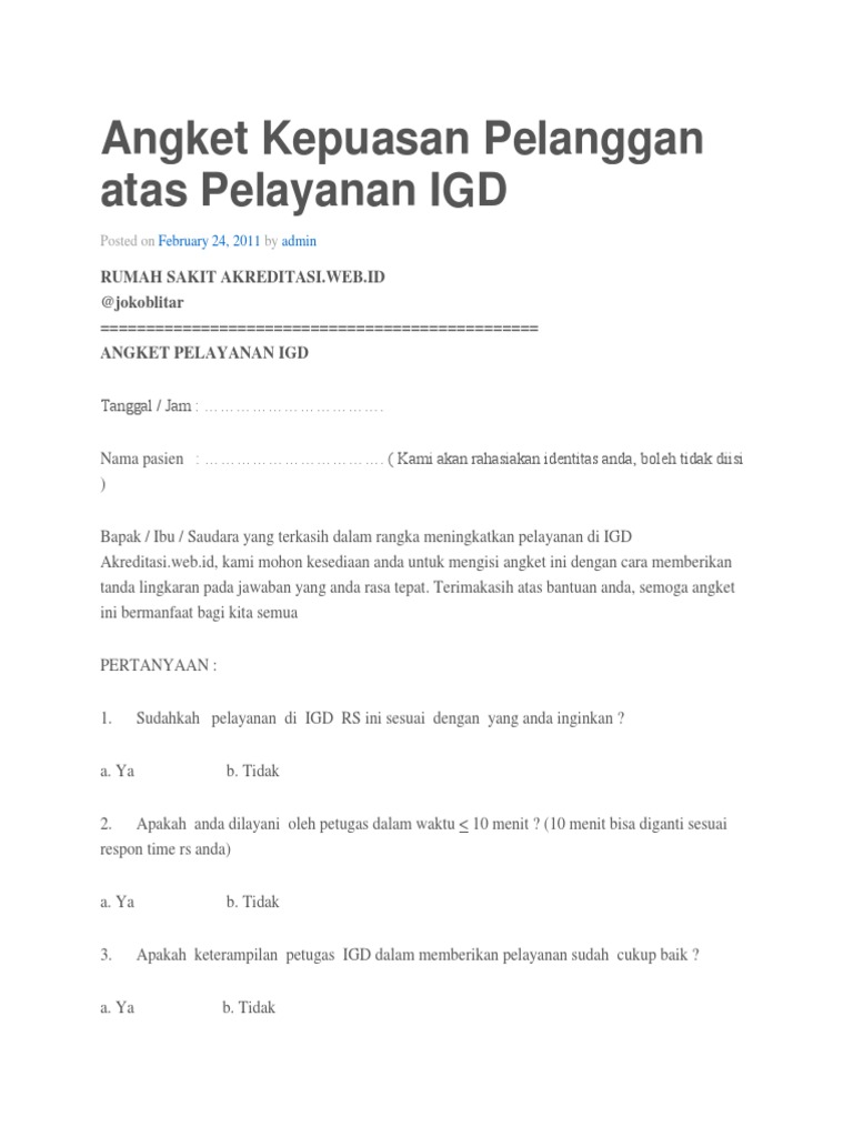Kuesioner hanya terbagi menjadi dua bagian utama yakni identitas respondenpelanggan dan kuesioner. Hubungan antara kepuasan pelanggan dan pelanggan yang loyal adalah tidak proporsional 2 contohnya adalah kepuasan pelanggan yang diranking dengan skala 1 5 yaitu. Contoh kuesioner kepuasan pelanggan 1. Related posts to contoh soalan soal selidik kepuasan pelanggan contoh soalan soal selidik kepuasan pelanggan 2020 07 11t111200 0700 rating. Contoh komunikasi vertikal contoh buku laporan harian satpam prosedur k3 yang berlaku di industri tugas 3 membaca teks anekdot dalam puisi soal. Demikianlah beberapa ulasan artikel tentang contoh surat pernyataan kepuasan pelanggan yang dapat anda jadikan referensi untuk mengetahui lebih jauh mengenai contoh surat pernyataan kepuasan pelanggan.