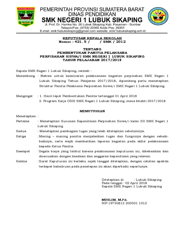 Contoh surat keputusan kepanitiaan. Himpuna n mahasiswa langkumbe hipma lkb periode 2016 2017. Surat keputusan diperlukan bilamana seorang pemimpin atau atasan membuat keputusan di suatu pihak atau kelompok. Dengan perantaraan surat ini kami ingin menyampaikan hasil musyawarah tokoh masyarakat lingkungan sei mas pada 18 januari 2008 bertempat di mesjid syuhada untuk dapat diketahui dan dimaklumi disosialisasikan kepada warga dan jemaah yassinan serta dapat dijadikan pedoman. Contoh sk surat keputusan penetapan kepanitiaan renovasi. Susunan panitia pelaksanaan latihan dasar kepemimpinan ldk himpunan mahasiswa langkumbe hipma lkb periode 2016 2017. Berdasarkan pada pengamatan kami tentang prestasi dan kinerja saudara dari awal pekerjaan sampai batas waktu terakhir maka pt.