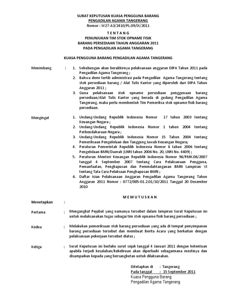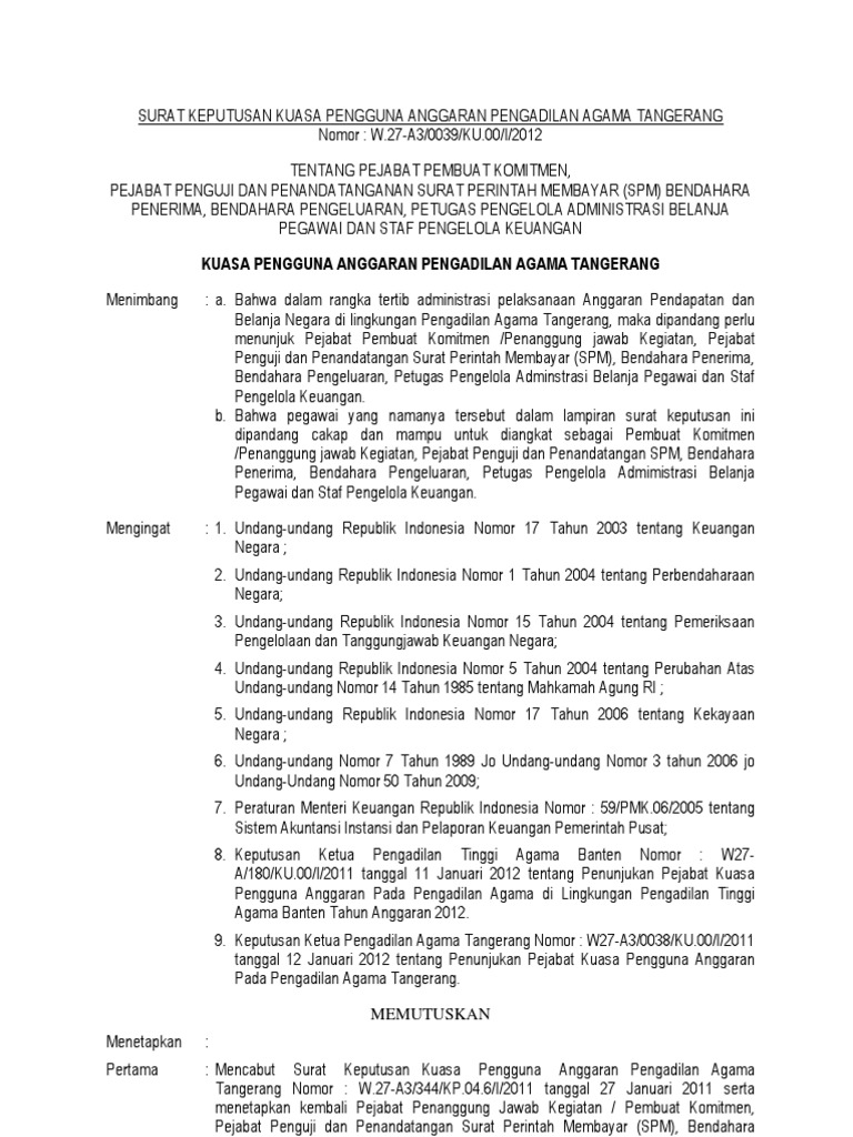Surat keputusan diperlukan bilamana seorang pemimpin atau atasan membuat keputusan di suatu pihak atau kelompok. Keputusan kuasa pengguna anggaranpengguna barang pengadilan agama polewali nomor. The collection that comprising chosen picture and the best among others. Tentang pengangkatan pejabat pemegang kartu kredit pemerintah dan pejabat administrator kartu kredit pemerintah pada satuan kerja direktorat jenderal hortikultura dengan rahmat tuhan yang maha esa kuasa pengguna anggaran direktorat jenderal hortikultura menimbang. W20 a2 01 ku01ski2015 tentang penunjukan pejabat penanggung jawab komitmen penguji dan penandatanganan sppspm bendahara pengeluaran bendahara penerimapnbp dan staf pengelola keuangan tahun anggaran 2015 di lingkungan pengadilan agama watampone. Menunjuk pengguna anggaran kuasa pengguna anggaran bendahara pengeluaran bendahara penerimaan dan bendahara penerimaan pembantu tahun anggaran 2010 sebagaimana dinyatakan dalam lampiran keputusan walikota ini.