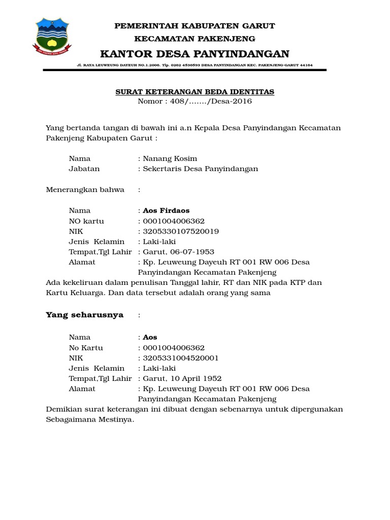 Contoh surat keterangan beda nama dari kelurahan kalau disebut dengan istilah beda nama sebenarnya kurang begitu tepat juga sih mengingat sebenarnya yang terjadi adalah beda penulisan nama seseorang yang dikarenakan adanya kesalahan. Raya payakumbuh suayan km 6 sariek laweh kode pos 26252. Ini contoh pada almh ayah saya karena beda nama pada bank ktp dan sk pensiun itu namanya beda itu kan jadi bermasalah utk mengurus. Surat keterangan domisili tempat tanggal lahir bisa dibuat keterangan lain namun dengan redaksi yang berbeda. Contoh surat keterangan tanah dari kepala desa. Surat pernyataan beda nama.