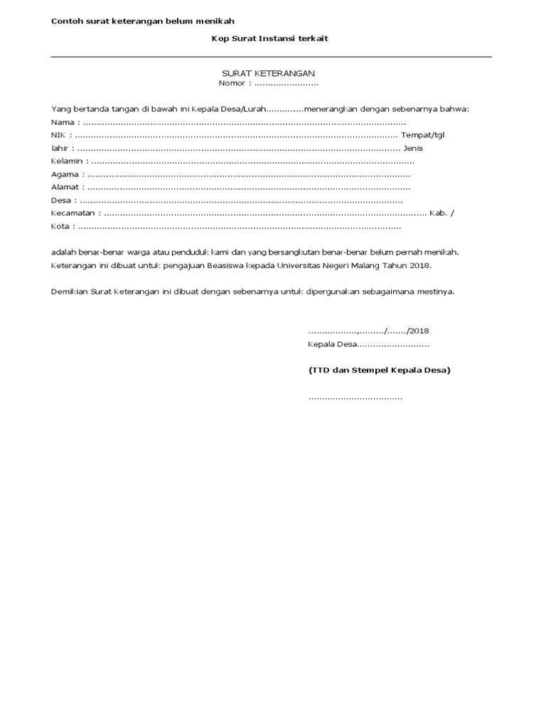 Terlebih jika penggunaan surat untuk komunikasi pribadi maka surat sudah sangat jarang kita temui. Surat keterangan belum menikah adalah surat yang dibuat untuk menerangkan bahwa yang membuat belum menikah. Surat ini dibuat oleh kelurahandesa tempat dimana si pembuat tinggal. Untuk dapat mendownload contoh surat keterangan belum menikah dalam format doc silahkan anda klik link yang tersedia berikut ini. Kebijakan ini biasanya dikeluarkan oleh perusahaan perusahaan yang menuntut profesionalisme tinggi dari. Contoh surat pernyataan belum menikah ketika seseorang hendak melamar suatu pekerjaan ada kalanya perusahaan yang dituju memberikan beberapa syarat khusus yang harus dipenuhi oleh seorang pelamarsalah satunya yaitu si pelamar diwajibkan masih berstatus lajang atau belum menikah.