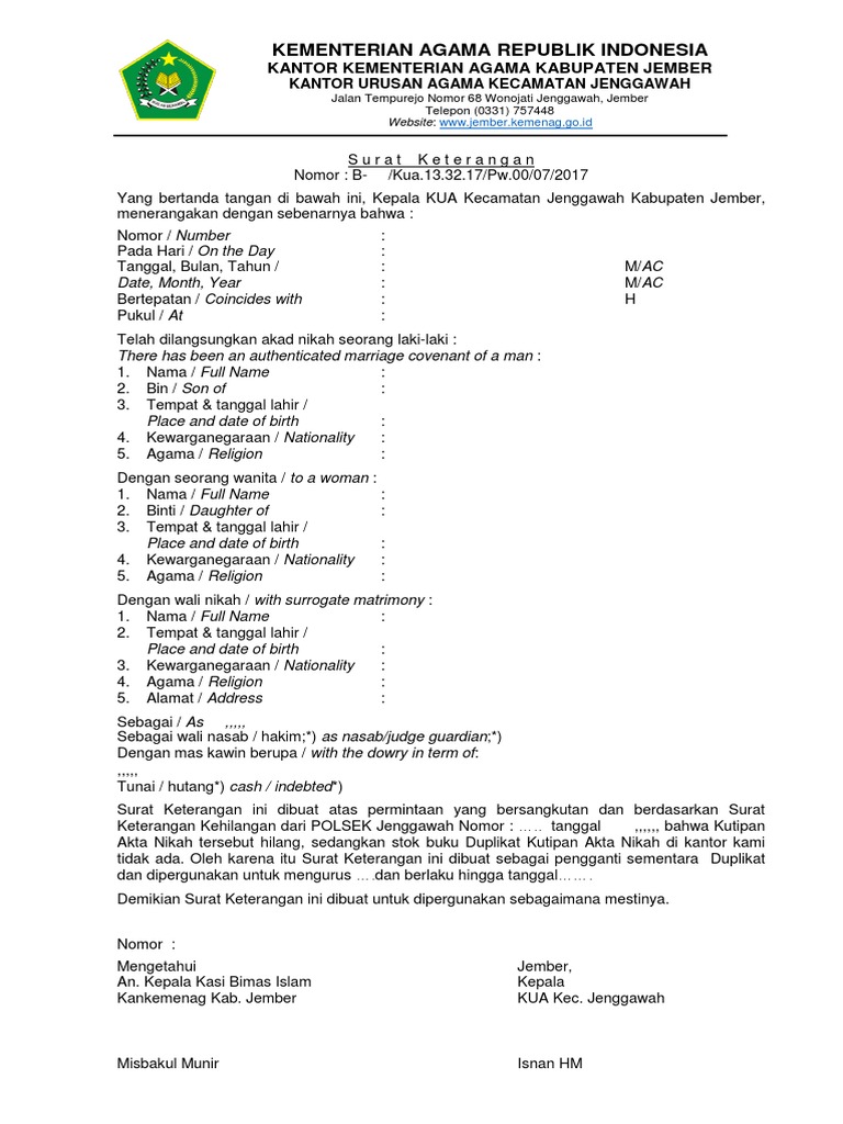 Contoh slip gaji karyawan swasta resmi format ms. Contoh surat nikah siri resmi education in 2019 perkawinan contoh surat keterangan nikah. Surat ini dibutuhkan misalnya sebagai pengganti buku nikah yang mungkin saja hilang atau terbakar atau karena hal lain. Bagi anda yang kehilangan akta nikah entah karena rusak hilang atau disebabkan bencana maka salah satu syaratnya adalah surat pengantar dari kua penerbit akta nikah anda ke kantor polisi bisa polres atau polsek untuk mendapatkan surat kehilangan. Contoh surat keterangan kehilangan ngurus surat keterangan hilang stnk di surabaya tidak bisa langsung surat kehilangan t keringa. Contoh surat keterangan sudah menikah.