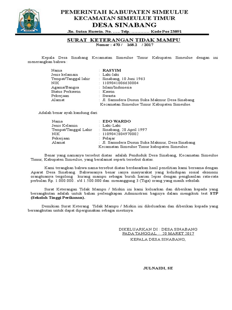 Contoh surat keterangan tidak mampu dari desa. Contoh surat keterangan tidak mampu bagi siswa yang tidak mendapatkan kpspip hanya diperuntukan bagi siswa yang benar benar tidak mampu. Dari ketiga contoh di atas memang tidak memiliki terlalu banyak perbedaan namun ada beberapa poin yang dapat menjadi bahan perbandingan dalam menyusun suatu surat keterangan tidak mampu. Contoh surat keterangan tidak mampu dari desa ketua rw ketua rt surat keterangan desember 18 2019 0633 surat keterangan tidak mampu merupakan surat yang dibuat untuk menyatakan atau menerangkan bahwa seseorang kurang mempunyai kemampuan atau kelebihan dalam aspek materiil di kehidupannya. Surat keterangan tidak mampu adalah sebuah surat yang mana dibuat dan dikeluarkan oleh pihak yang berwenang ketua rt ketua rw kepala dusun kepada desa dan lainnya untuk dapat menerangkan bahwa seseorang yang telah disebutkan dalam surat tersebut merupakan salah atu warga yang tidak mampu yang berdomisili di daerah tertentu. Surat keterangan tidak mampu ialah sebuah surat yang dibuat dan dikeluarkan dari pihak yang berwenang ketua rt ketua rw kepala dusun kelurahan kepala desa sekolah dan lainnya untuk dapat menerangkan bahwa warganya yang telah disebutkan dalam surat tersebut merupakan salah satu warga yang tidak mampu yang berdomisili di daerah tertentu.