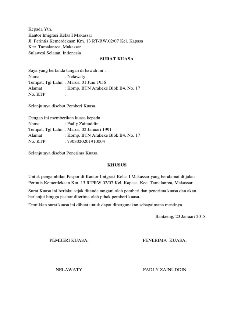 Contoh surat kuasa pembuatan paspor. Pada kesempatan ini saya akan memberikan contoh kuasa pengacara yang baik dan benar kepada anda yang membutuhkannya. Contoh surat kuasa pengambilan paspor 2. Contoh surat permohonan pengambilan paspor lama bagi pemohon penggantian paspor contoh format fotokopi persyaratan paspor. Demikian surat kuasa ini dibuat untuk dapat dipergunakan sebagaimana mestinya. 0123456789 tempattgi lahir. Karena pihak imigrasi tidak akan menyerahkan paspor kita orang lain maka hal ini yang melatar belakangi pembuatan surat kuasa pengambilan paspor ini.