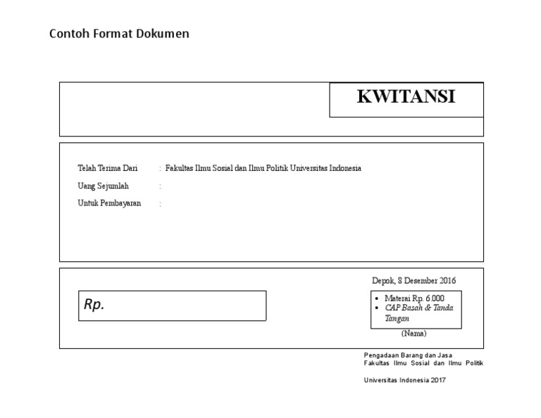 Tetapi pada umumnya kwitansi yang digunakan dalam pembayaran mempunyai format yang terdiri dari komponen sebagai berikut.