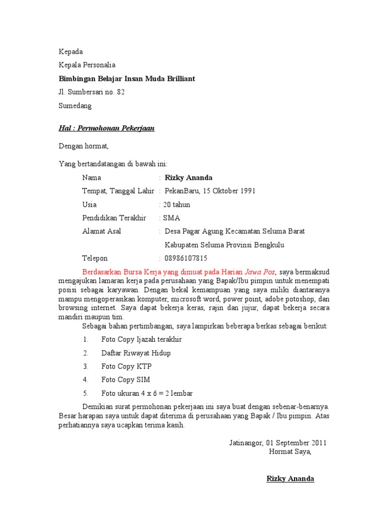15 contoh surat lamaran kerja dalam bahasa inggris yang baik setiap orang tentu memiliki pengeluaran yang harus dipenuhi setiap harinya. Nah jika anda juga berencana melamar pekerjaan di perusahaan maka contoh surat lamaran kerja di persuahaan yang akan saya bagikan di bawah ini patut anda simak. Contoh surat lamaran kerja guru bimbel atau pengajar sangat diperlukan bagi anda yang berkeinginan sebagai tenaga pengajar baik di lembaga pendidikan sekolah perguruan tinggi hingga kursus dan bimbingan belajar bimbelagar anda tak kesulitan lagi silakan perhatikan berbagai contoh surat lamaran kerja sebagai guru bimbel. Dengan hormat berdasarkan informasi yang saya peroleh dari ibu selvi anita salah seorang tenaga pengajar bapakibu bahwa bimbel gama ui bogor sedang membutuhkan tenaga. Contoh surat lamaran kerja ini dibuat tentu saja untuk menjadi referensi bagi anda yang sedang mencari panduan untuk membuat surat lamaran kerja. The collection that comprising chosen picture and the best among others.