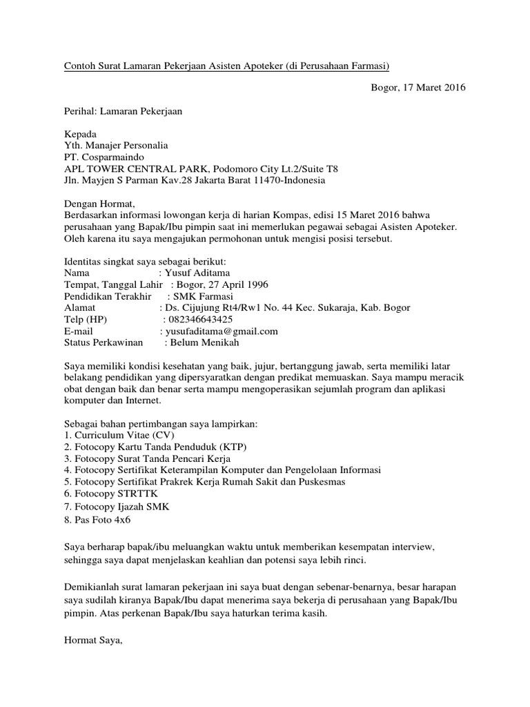 Contoh Surat Lamaran Pekerjaan Asisten Apoteker Di Apotek