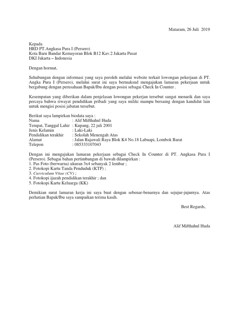 Contoh surat lamaran kerja di pt angkasa pura. Surat lamaran kerja angkasa pura adalah surat yang dibuat oleh seseorang untuk mengajukan lamaran pekerjaan dalam rangka mengisi salah satu posisi yang sedang dibutuhkan oleh perusahaan pt. Surat lamaran kerja pt angkasa pura 1 semua pekerjaan adalah sesuatu yang mulia sebab bekerja untuk menafkahi diri sendiri merupakan arti hidup yang kudu dihadapi. Berikut informasi sepenuhnya tentang contoh surat lamaran kerja pt angkasa pura ii. Surat lamaran kerja angkasa pura secara umum memiliki format yang sama dengan surat lamaran pekerjaan lainnya. Contoh surat lamaran kerja angkasa pura merupakan contoh gratis pada pembahasan contoh surat yang di posting oleh gawe cv. Dengan mengetahui kriteria dan kebutuhan rekrutmen yang telah dijelaskan diatas dengan demikian para pencari kerja yang merasa memenuhi persyaratan meliputi pendidikan umur dll dan memang merasa berminat dengan lowongan kerja terbaru pt angkasa pura i persero pada bulan januari 2020 diatas hendaknya secepatnya untuk melengkapi dan menyusun berkas lamaran kerja seperti surat lamaran kerja.