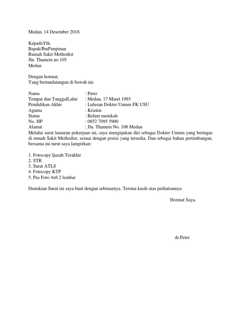 Contoh surat lamaran kerja dokter umum. Kita sebagai jika sudah mempunyai pengalaman dan surat tanda registrasi maka kita berhak dan bebas bila ingin bekerja di manapun ataupun kita bisa membuka klinik sendiri. Contoh surat lamaran kerja membuat surat lamaran kerja tidak boleh asal dalam membuatnya membutuhkan acuan sebagai referensi contoh surat lamaran kerja ini adalah salah satu bahan yang bisa dijadikan acuan dalam membuat surat lamaran pekerjaan. Surat lamaran biasanya bersandingan dengan cv lamaran kerjakeduanya adalah kunci penentu kamu diterima atau ditolak suatu instansi. Contoh surat lamaran kerja hai sobat sharing kali ini saya kan bahas soal contoh surat lamaran kerja yang baik dan benar. Memang tidaklah sulit untuk membuatnya tetapi akan membutuhkan waktu untuk menyusun rangkaian kalimat sehingga. 15 contoh surat lamaran kerja di rumah sakit berbagai posisi bekerja di suatu rumah sakit tentu merupakan impian yang sangat besar bagi seseorang.