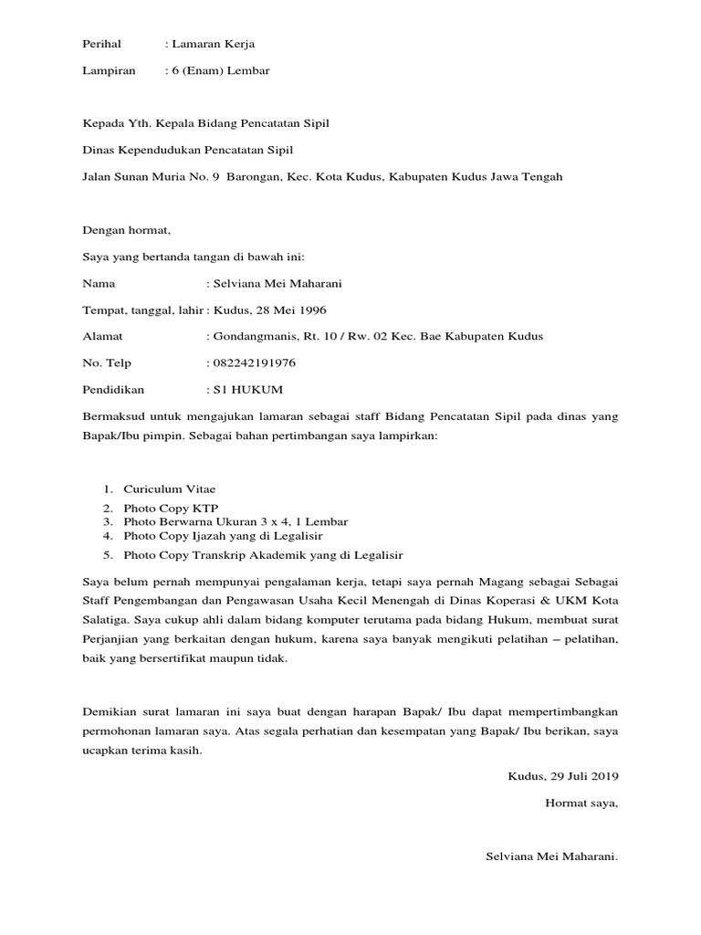 Contoh surat lamaran kerja ke dinas. Seringkali suatu instansi perusahaan meminta surat lamaran dalam versi doc ataupun tulis tangan. Mengguanakan bahasa yang tepat. Hindari terjadi kesalahan penulisan kata. Terima kasih sudah berkunjung ke blog contoh surat lamaran kerja terbaru 2016 ini dan semoga lamaran kerja anda diterima di instansi pemerintah daerah tempat anda melamar. Surat lamaran kerja dibutuhkan guna melamar pekerjaan baru untuk kamu yang baru lulus kuliah pindah kerja cari suasana baru maupun fresh graduate. Hal ini karena kesalahan yang anda lakukan dapat mempengaruhi hasil yang akan anda dapatkan.