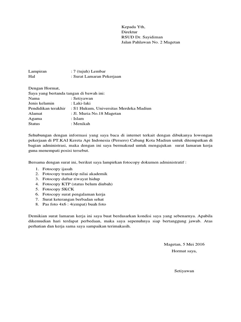 Contoh surat lamaran kerja di pt kai dengan semakin meningkatnya sarana dan prasarana tranportasi di indonesia terutama untuk jalur darat membuat pemerintah indonesia berinisiatif untuk menciptkan cabang transportasi baru di bidang kereta api baik dengan menciptakan monorail ataupun dengan membuka gerbong gerbong kereta baru yang dikepalai oleh pt kereta api indonesia persero. Saat ini sarana maupun prasarana transportasi terus meningkat di indonesia terutama di jalur darat. The collection that comprising chosen picture and the best amongst others. Contoh surat lamaran kerja di pt kai sudah menjadi hal yang lumrah ketika melamar kerja di suatu badan usaha atau instansi kita sebgai pelamar kerja membuat surat lamaran kerja. Sama hal nya ketika anda ingin melamar kerja di pt. Kai anda juga diharuskan membuat surat lamaran kerja yang ditujukan kepada pt kai.