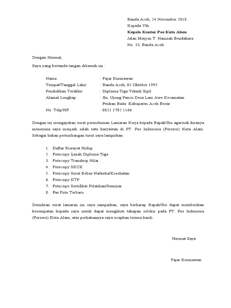 Contoh surat lamaran kerja pt pos indonesia. Contoh surat lamaran kerja pada artikel ini kita akan membahas contoh surat lamaran pekerjaan yang dapat kamu dapatkan beserta file doc nya. Contoh surat lamaran kerja pos indonesia have a graphic associated with the othercontoh surat lamaran kerja pos indonesia it also will include a picture of a kind that could be observed in the gallery of contoh surat lamaran kerja pos indonesia. Contoh surat lamaran kerja pt pos indonesia format resmi 2020 postingan kali ini kami ingin share contoh surat lamaran kerja pt pos indonesia. Contoh surat lamaran kerja di perusahaan seringkali dicari oleh para pencari kerja yang ingin mengajukan lamaran pekerjaan di perusahaan perusahaan yang ada di indonesia. Postingan ini jawaban jika anda mencari surat lamaran kerja skl yang pas dan mudah didownloadedit dengan microsoft word. Di tahun 2016 ini pos berperan sangat penting dalam membantu masyarakat indonesia pada umumnya sebab dengan kemudahan.