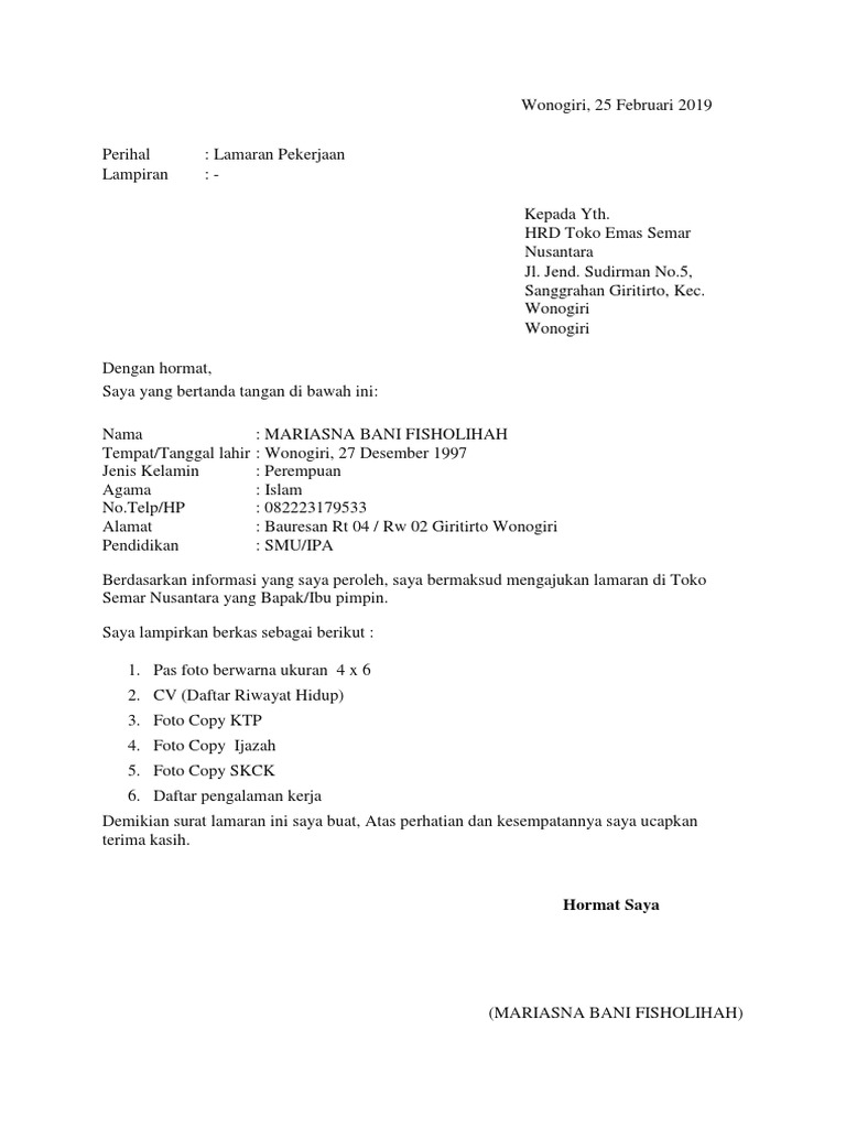 Contoh surat lamaran pekerjaan di toko emas. Contoh surat lamaran kerja di toko baju tulis tangan contoh surat lamaran pekerjaan di toko baju. 15 surat lamaran kerja di toko bentuk doc. Contoh surat lamaran kerja di toko emas. 10 contoh surat lamaran kerja di toko. Contoh surat lamaran pekerjaan di toko emas semakin besar toko maka akan semakin banyak pula karyawan yang dibutuhkan. Mudah mudahan contoh lamaran pekerjaan karyawan toko ini dapat membantu anda dalam menulis surat lamaran kerja tersebut.