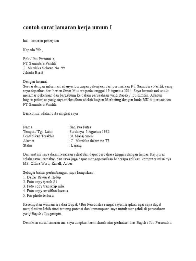 Seperti kegiatan sebuah perlombaan yang diadakan organisasi ekstrakulikuler di sekolah yang dimana sebelum mereka mengadakan perlombaan harus memiliki surat resmi yang akan diajukan kepada kepala sekolah sebagai permohonan dan menerangkan bahwa organisasi tersebut. Surat lamaran kerja adalah surat yang digunakan untuk melakukan permohonan mendapatkan pekerjaan sesuai pengalaman pada perusahaan tertentu. Contoh surat lamaran kerja berikut contoh surat lamaran pekerjaan yang bisa kamu download file dokumennya. Surat lamaran kerja dibutuhkan guna melamar pekerjaan baru untuk kamu yang baru lulus kuliah pindah kerja cari suasana baru maupun fresh graduate. Nah bagi yang melamar pekerjaan karena mendapatkan informasi dari iklan bisa mencantumkan dari iklan mana informasi tersebut didapat. Kepala bagian personalia the blitz jl.