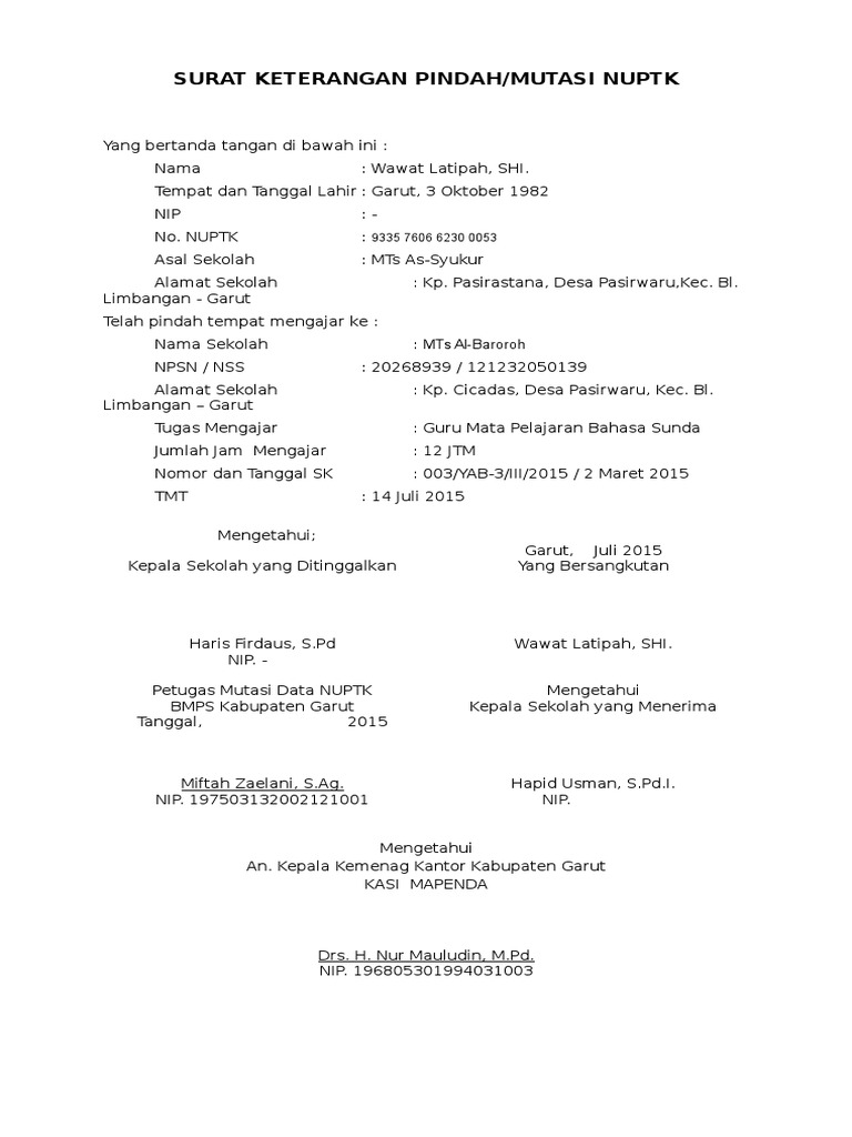 Contoh surat mutasi guru. Contoh surat mutasi guru dari kepala sekolah asal format doc ops mutasi kerja pns surat permohonan pindah tugas pns guru resmi nehanesia contoh surat rekomendasi mutasi guru paudtk dari kepala sekolah contoh surat mutasi guru postingangurublogspot contoh. Nama tempat tanggal lahir nip nuptk asal sekolah alamat sekolah jabatan awal. Adapun contoh surat keterangan atau surat rekomendasi lolos butuh bagi guru yang akan pindah atau mutasi yang akan saya bagikan pada postingan ini dapat anda miliki secara gratis dan filenya pun tersimpan dalam format word sehingga mudah untuk di edit dan di sesuaikan dengan kebutuhan pengguna. Contoh surat mutasi guru buat para guru yang ingin mutasi maka wajib untuk membuat surat mutasi. Untuk setiap instansi mungkin berbeda beda namun pada umumnya harus melampirkan fotocopy sk fotocopy karu pegawai fotocopy ijazah terakhir fotocopy absensi riwayat hidup bahkan surat rekomendasi. Dimana surat mutasi guru ini digunakan untuk menjadi bukti formalitas dan syarat mutasi guru.