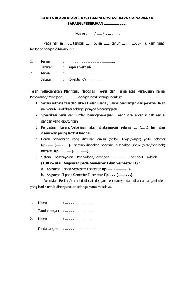 Contoh surat penawaran kerjasama surat penawaran kerjasama sangat sering digunakan dalam lingkup perusahaan baik perusahaan yang besar maupun kecil. Berdasarkan hasil evaluasi penawaran kami perlu melakukan negosiasi dengan pihak saudara atas penawaran harga yang ditawarkan sebesar rp. Komputer tahun anggaran 2011 telah melakukan evaluasi penawaran terhadap surat penawaran harga no. Berita acara negosiasi harga berikut ini anda bisa lansung copypaste berita acara negosiasi harga ini untuk kelengkapan administrasi contoh berita acara. Kami informasikan bahwa panitia pengadaan peralatan lab. Contoh surat penawaran barang produk negosiasi makanan harga march 22 2020 april 3 2019 by 4dm1n contoh surat penawaran barang pengertian surat penawaran ialah surat yang ditulis untuk menunjukkan maksud dan tujuan suatu perusahaan untuk menjalin kerja sama kepada perusahaan lainnya.