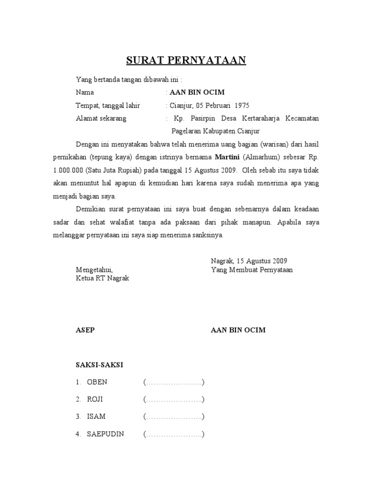 Doc contoh surat pernyataan ahli waris deef kazt academiaedu. Contoh surat keterangan kesepakatan para ahli waris atas pembagian harta warisan dari harta yang meninggalkan ayah. Contoh surat warisan contoh surat pembagian warisan rumah in addition it will include a picture of a sort that could be seen in the gallery of contoh surat pembagian warisan rumah. Adapun kesepakatan kami adalah sebagai berikut. Surat ini biasanya dibuat oleh seorang anak atau anggota keluarga yang berhak menerima warisan dari orang yang telah meninggal dunia. Sebagai ahli waris kami telah bersepakat mengenai pembagian tanah warisan dari alamarhum bapak warsito yang terletak di jl.