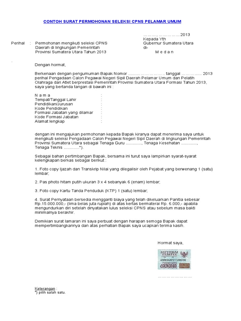 Download Contoh Format Surat Lamaran Pernyataan Seleksi Cpns