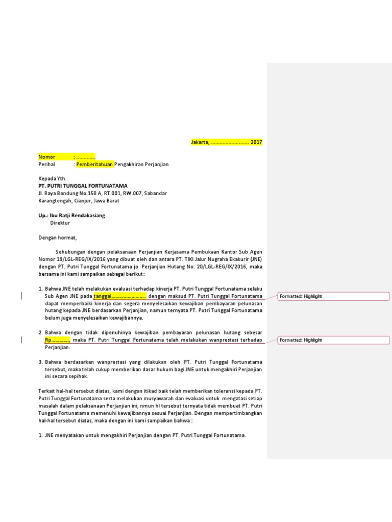 Sehubungan dengan pelaksanaan perjanjian konstruksi nomor tanggal yang dibuat oleh dan diantara pt. Kendari 22 oktober 2015. Kamis 18 mei 2017 contoh surat pengakhiran pemutusan kerjasama nama instansi jl. Pihak pertama dan pt. Perjanjian kerjasama tersebut antara kedua belah pihak untuk melakukan kerjasama dalam suatu pekerjaan yang terikat kontrak selama periode. 3019sax2015 lampiran perihal.