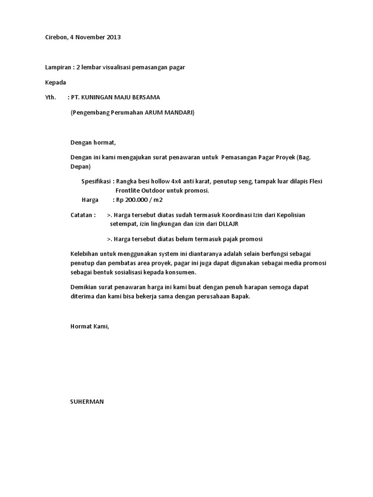Contoh surat penawaran surat penawaran yaitu surat yang ditulis guna menyampaikan maksud suatu perusahaan untuk menjalin kerjasama dengan perusahaan lainnya. Surat permintaan penawaran adalah surat yang dibuat oleh calon pembeli berisi permintaan penawaran kepada penjual. Umumnya surat penawaran digunakan oleh perusahaan perusahaan penyaluran dalam hal ini distributor. Jika kamu sedang membutuhkan contoh surat penawaran harga proyek kami akan berikan format surat penawaran sebagai referensi. Disamping memiliki pengaruh yang baik untuk membuat jenis usaha kita dapat laris dan laku dipasaran. Rasanya bahakan tidak cukup hanya dengan memasang iklan di tempat tempat strategis surat kabar membuat banner elektronik hingga mengandakan endorsement dengan orang orang terkenal.