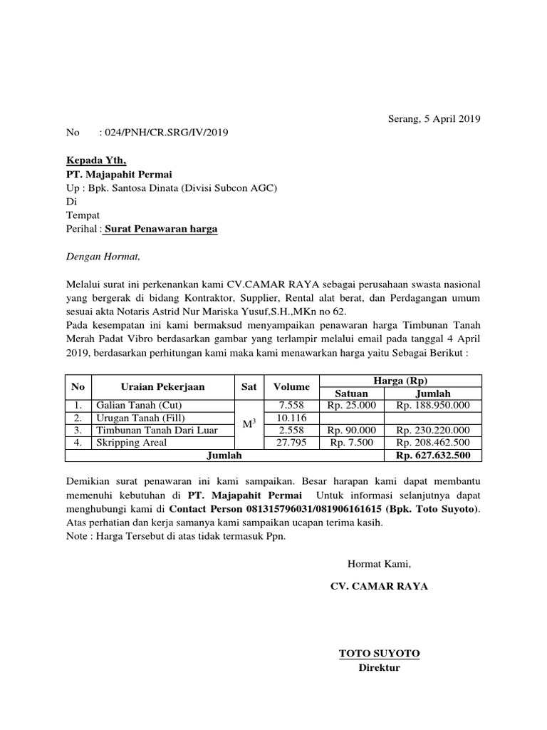 Contoh surat penawaran menjadi seorang pengusaha atau bisnisman pasti akan mengenal salah satu jenis surat resmi ini. Dalam contoh surat penawaran harga tanah urug gawe cv telah memilihkan tema atau template yang terbaik untuk dijadikan inspirasi ide ataupun acuan dalam penulisan surat anda. Surat perjanjian komitmen fee. Contoh surat penawaran harga urugan. Simpan simpan contoh surat penawaran harga tanah untuk nanti. Anda dapat melihat dengan jelas contoh surat penawaran harga urugan tanah menggunakan desktop anda tablet android atau iphone dan perangkat smartphone lainnya secara gratis.
