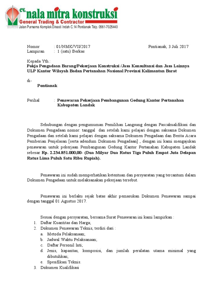 Contoh surat penawaran harga jasa konstruksi adalah gambar contoh penawaran berdefinisi tinggi dan memiliki ukuran 768x1174. Kamu sedang membutuhkan contoh surat penawaran harga proyekkami akan berikan referensi contoh surat penawaran dalam format word doc yang bisa didownload secara gratis. Contoh surat penawaran jasa konstruksi baja ringan. 330 bukit tinggi jakarta selatan telp. Contoh surat penawaran jasa katering. Contoh surat penawaran surat penawaran barang produk dan jasa serta kerjasama kepada pihak perusahaan instansi agar dapat tercipta kerjasama.