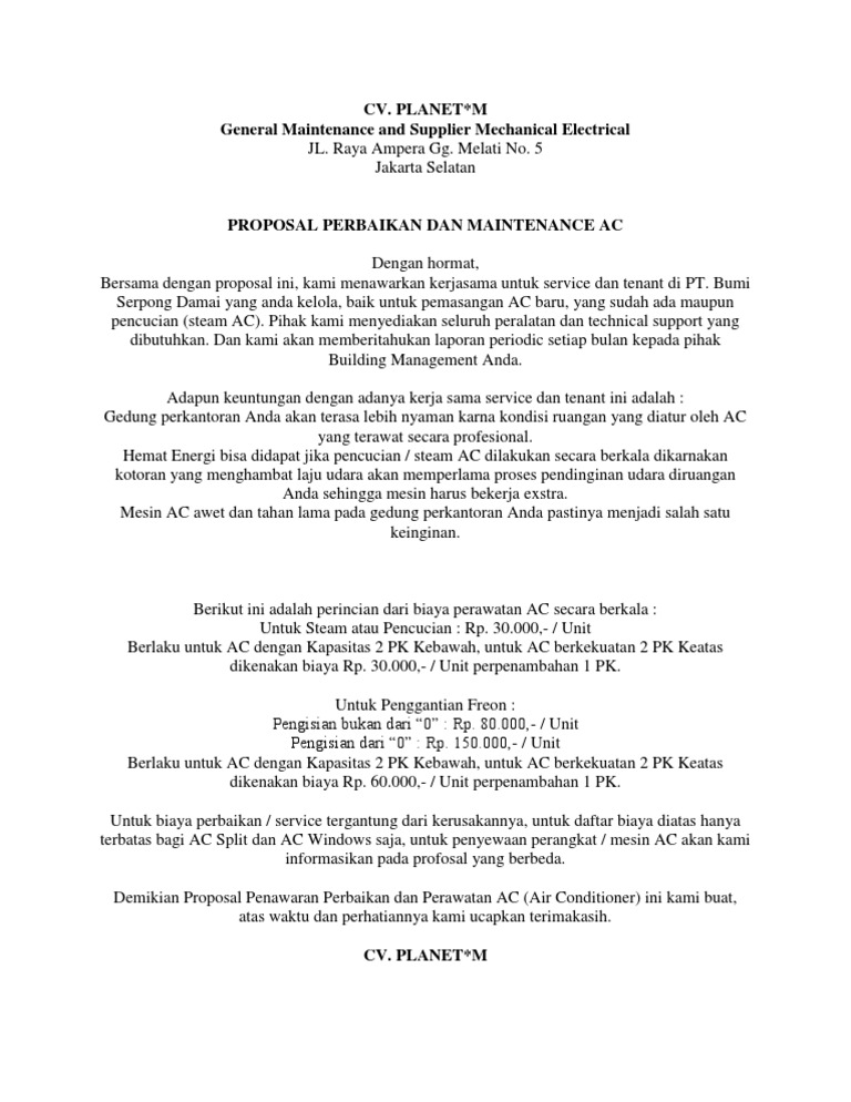Jenis surat ini tergolong masih merupakan salah satu jenis surat yang masih relevan untuk digunakan pada saat sekarang ini. Contoh surat penawaran jasa service ac kebutuhan akan perangkat ac sekarang ini sudah merupakan kebutuhan yang sangat penting dalam berbagai bangunan perkantoran. Posted at 1625 2 comments 2 responses to surat penawaran service ac semarang unknown 12 februari 2017 1930. Dengan hormat bersama dengan proposal ini kami menawarkan kerjasama untuk service dan maintenance ac di tempat yang bapakibu pimpin baik untuk pemasangan ac baru yang sudah ada maupun pencucian steam ac. Demikian contoh surat penawaran harga yang diharapkan berguna bagi anda. Surat penawaranproposal service ac contoh surat penawaran.