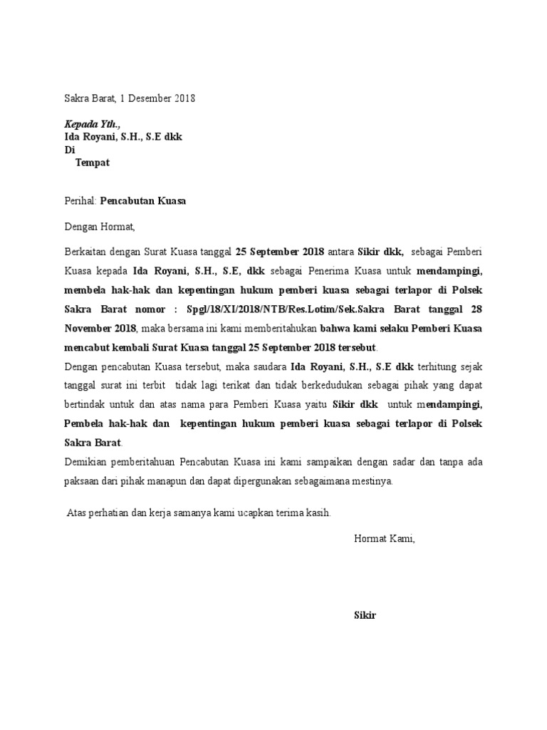 Dengan demikian surat kuasa tersebut tidak berlaku dan tidak dapat dipergunakan lagi sehingga secara otomatis membebaskan segala kewajiban yang harus dilaksanakan penerima kuasa dan juga membebaskan penerima kuasa dari segala akibat hukum. Contoh format pencabutan surat kuasa pengertian surat surat adalah alat pengirim berita secara tertulis pengertian secara sempit. Dengan dilakukannya pencabutan pemberian kuasa tersebut maka sejak tanggal dibuat dan ditandatanganinya surat ini saudara tidak lagi berkedudukan sebagai pihak yang dapat mewakili serta bertindak untuk dan atas nama. Bandung 3 september 2016. Dengan pencabutan surat kuasa tersebut maka surat kuasa tersebut dinyatakan tidak berlaku dan tidak dapat dipergunakan lagi. 18 tahun 2003 tentang.
