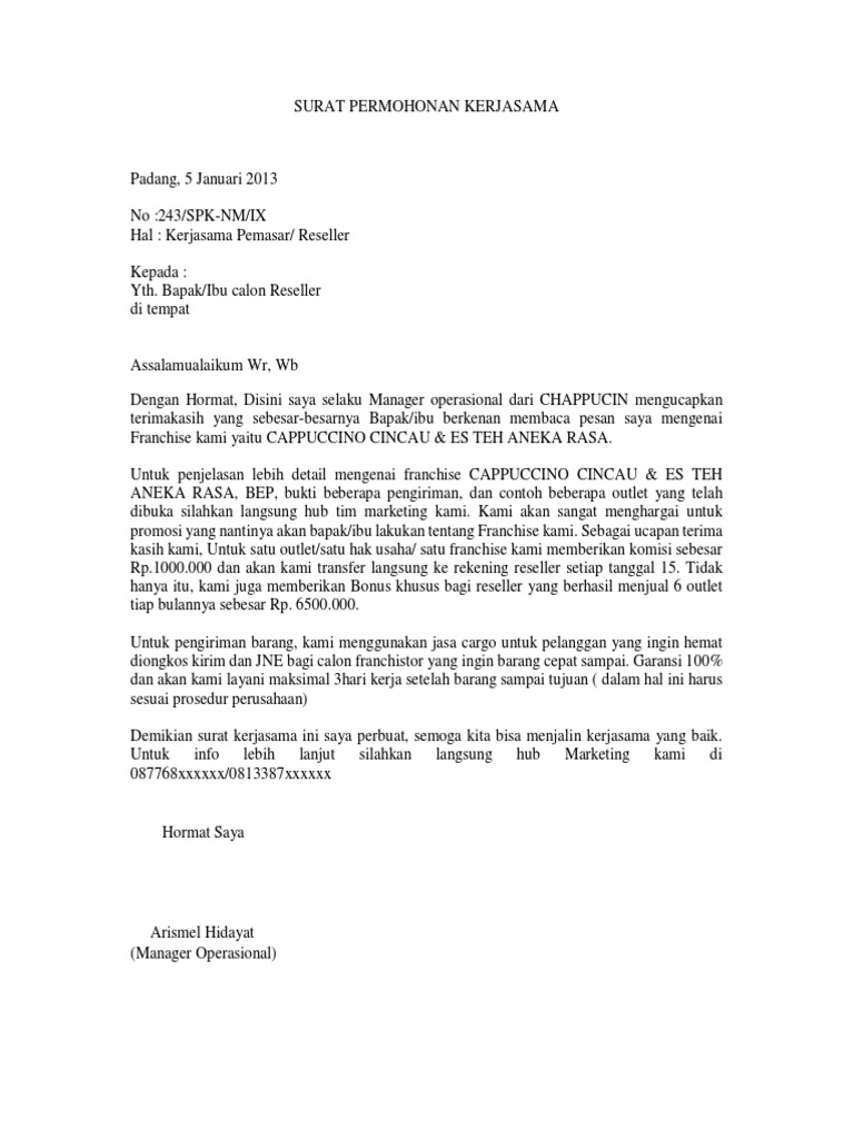 Contoh surat pengajuan kerjasama. Pengajuan atau permohonan bisa dibuat oleh bawahan kepada pimpinan ataupun antar instansi dan kantor. Untuk mendownload contoh surat perjanjian kerjasama usaha ini kamu dapat mengunduhnya dengan membagikan artikel ini terlebih dahulu di salah satu sosial media kamu. Salah satu contoh adalah kerjasama pertukaran pelajar yang tentu sudah tidak asing lagi kita dengar. Surat permohonan kerjasama format dan contoh surat kerjasama kegiatan produk surat permohonan kerjasama merupakan sebuah surat resmi yang dibuat untuk menawarkan sebuah permintaan atau permohonan kerjasama kepada seseorang atau perusahaan agar mereka mau menerima tawaran yang kita berikan. 03 july 2019. 03 july 2019.