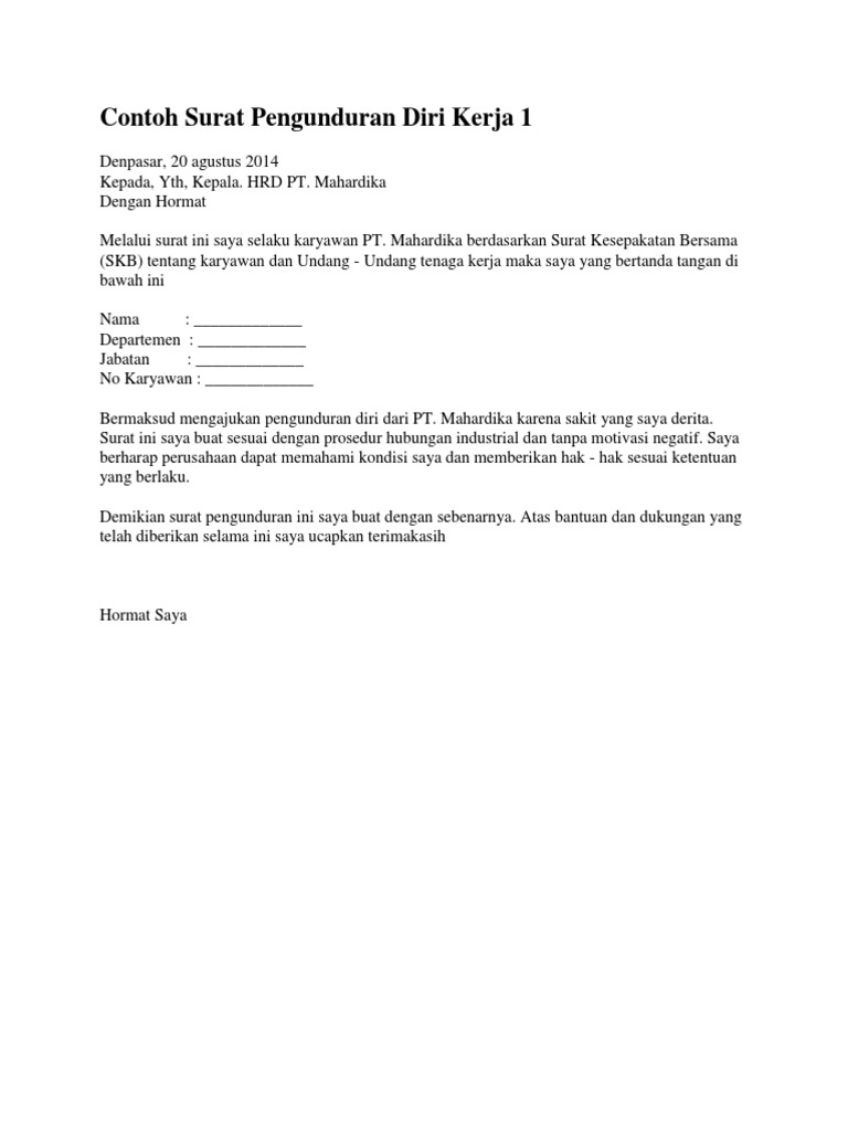 Contoh surat pengunduran diri hallo sobat sharingsetelah beberapa waktu lalu saya bahas soal contoh surat lamaran kerja kali ini saya akan sharing tentang contoh surat pengunduran diri contoh surat resign. Ketika anda yakin mengundurkan diri dari kantor selama ini prosedur yang menjadi prioritaskan yaitu membuat surat resign. Ketika anda yakin mengundurkan diri dari kantor selama ini prosedur yang menjadi. Kepada yth hrd manager. Untuk mendownload gambar diatas dalam format msword silahkan klik link berikut. Mengundurkan diri adalah sesuatu yang wajar dilakukan oleh siapaun yang berada dalam sebuah tanggung jawab perusahaan organisasi atau instansi lainnya.