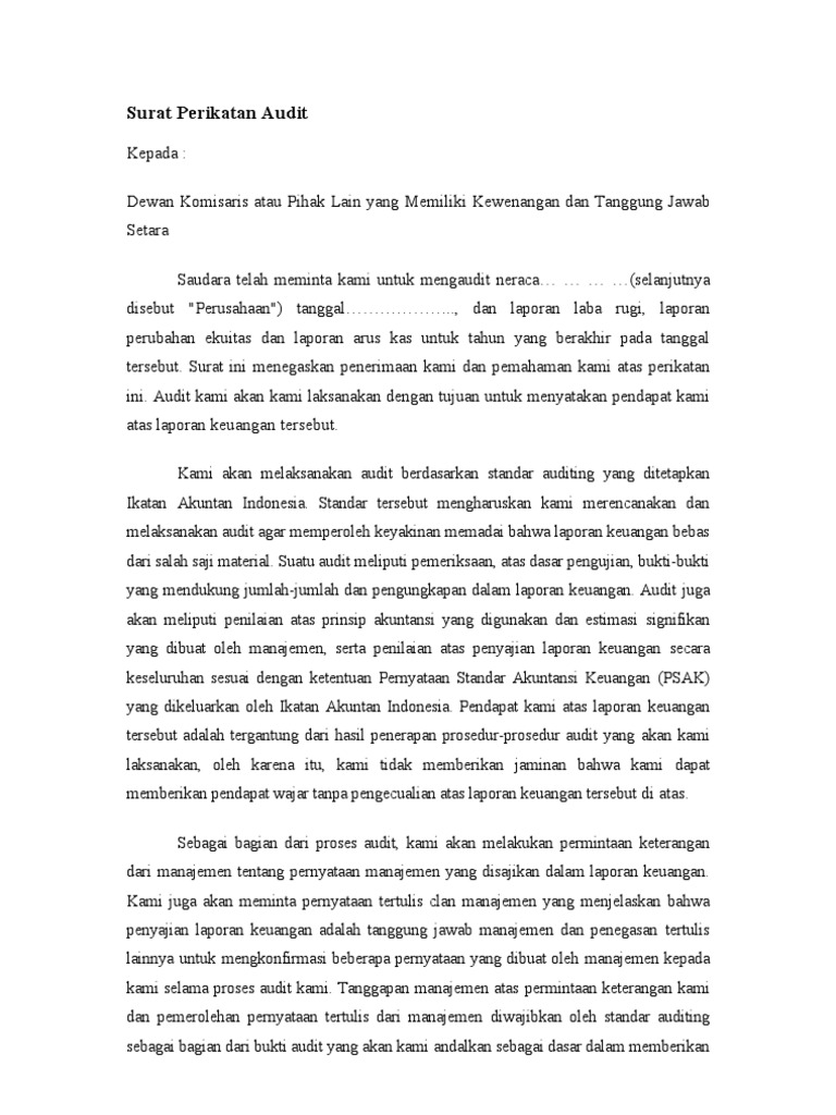 Contoh surat perikatan audit. 0011ka1995 makassar 05 februari 1995 hal. Surat penawaran adalah surat yang dibuat untuk menjalin sebuah kerjasama atau menawarkan barang maupun jasa pada suatu perusahaan ke. Audit kami akan kami laksanakan dengan tujuan untuk menyatakan pendapat kami atas laporan keuangan tersebut. Mudah mudahan isi postingan artikel auditing yang kami tulis ini dapat anda pahami. Contoh surat permohonan audit inestigasipemeriksaan terhadap perseroan terbatas ke hadapan pengadilan negeri yang diajukan oleh pemegang saham minoritas karena laporan tahunan tidak menggunakan standar audit akuntansi yang diakui negara. Bentuk dan isi surat perikatan audit dapat bervariasi di antara klien namun surat tersebut umumnya berisi.