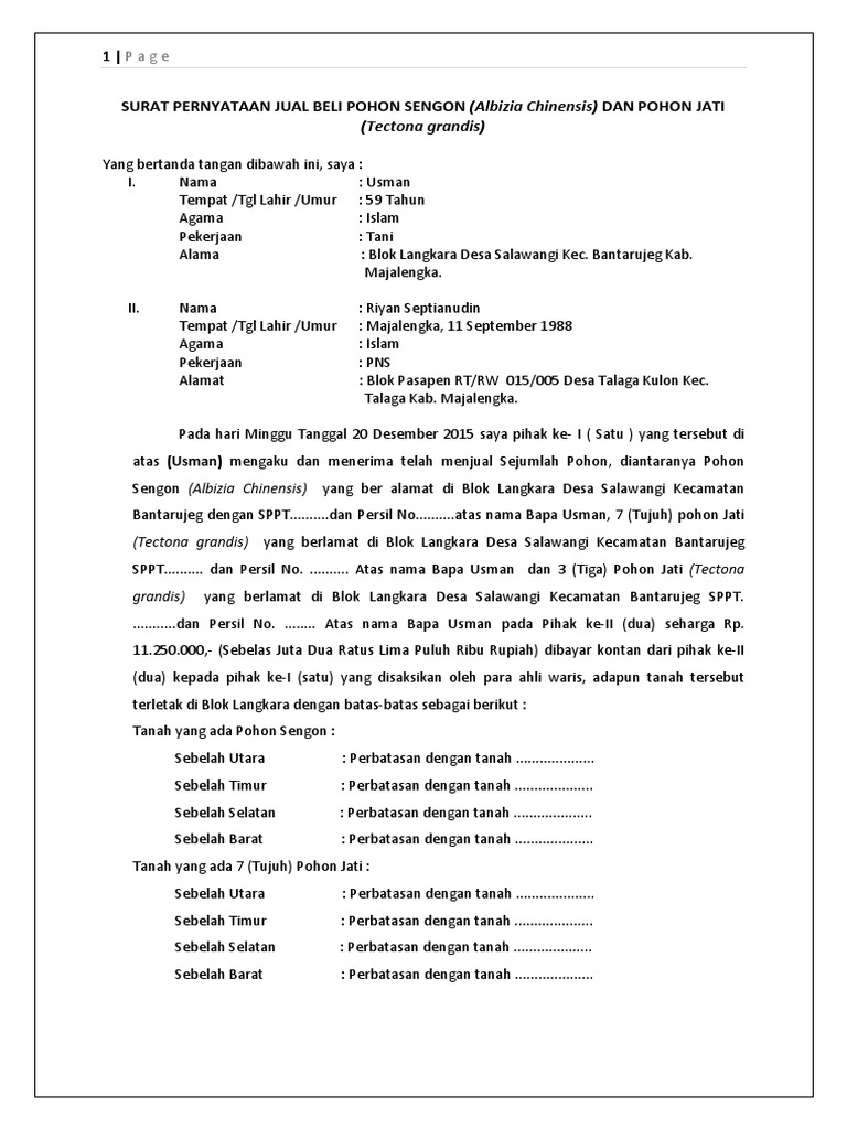 Status tanah adalah tanah girik dengan akta jual beli di notaries. Pasal pasal itu tidak memiliki batasan pada segi jumlah. Dalam proses transaksi jual beli rumah maupun jual beli apapun yang memiliki nilai jual tinggi sebaiknya digunakan contoh surat perjanjian jual beli rumah dengan 11 pasal berikut ini. Contoh surat perjanjian jual beli adalah surat yang dibuat oleh pihakpihak yang ingin melakukan transaksi jual beli harta benda berharga dengan nilai harga yang cukup besar seperti kendaraan bangunan tanah perhiasan dan barangbarang berharga lainnya. Jual log kayu sengon selamat siang saya mempunyai rekanan yang ingin menjual dan memasok kayu sengon secara rutin dari kebun di daerah jawa barat. Hal ini bertujuan untuk mencegah hal hal yang tidak diinginkan menghindari sengketa dan mengikat kedua belah pihak yaitu penjual dan pembeli untuk terikat dan bertanggung jawab atas proses jual beli.