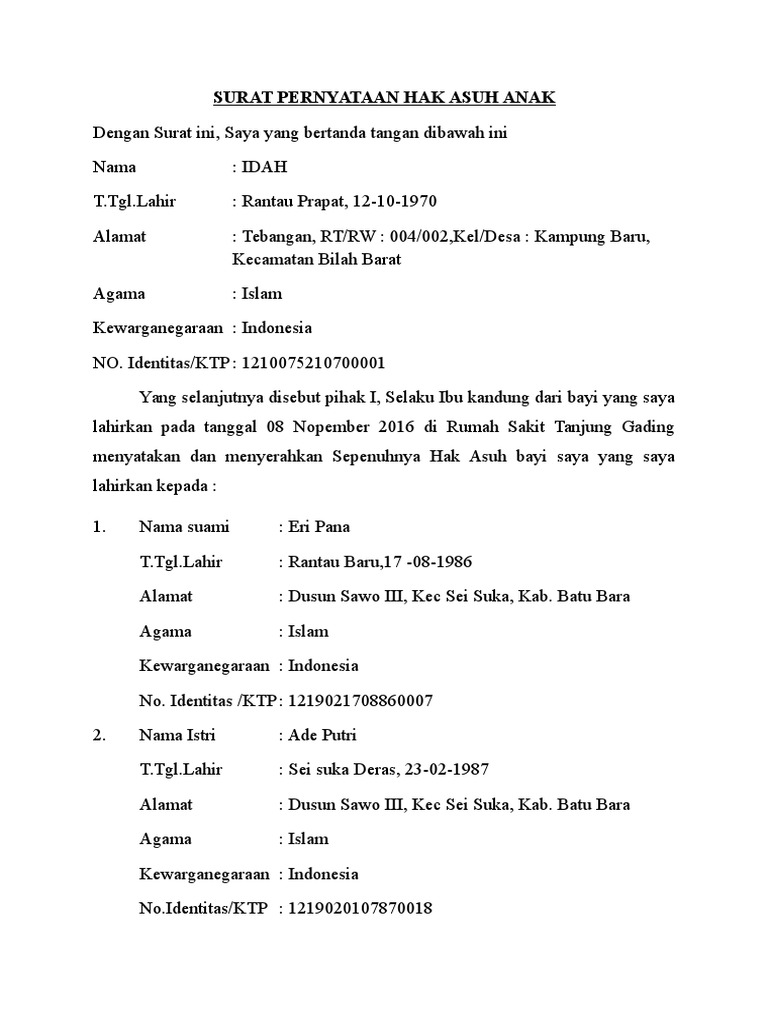 6000 fotokopi ktp orangtua kandung calon orangtua asuh dan dua orang saksi fotokopi akta kelahiran anak. Surat yang berisi kesepakatan inilah yang kemudian diberi nama surat perjanjian. Perjanjian hak asuh anak. Cerai adalah masaalah yang menyebapkan putusnya hubungan suami istri. Anak adalah tanggung jawab bagi orang tua untuk memberi nafkah. Bahaudin sag alias bahaudin bin hm.