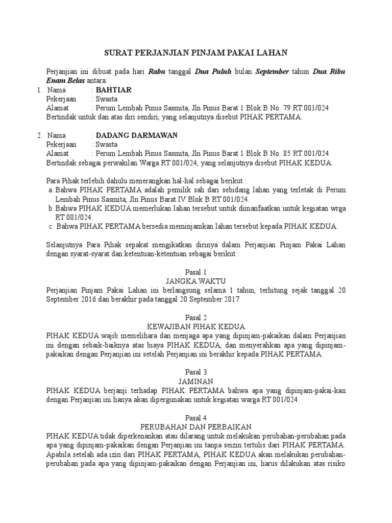 Contoh surat perjanjian pinjam pakai tanah. Contoh yang kami berikan disini adalah untuk objek rumah. Surat perjanjian pinjam pakai adalah surat perjanjian antara pihak yang meminjamkan barangaset pemberi pinjaman kepada pihak peminjam untuk digunakan secara gratis dengan ketentuan bahwa peminjam wajib mengembalikan barangaset yang dipinjam tersebut telah dipakai atau setelah sampai jangka waktu tertentu sebagaimana yang diperjanjikan. Perjanjian pun bisa dibuat dengan cara lisan dan cara tertulis. Surat yang berisi kesepakatan inilah yang kemudian diberi nama surat perjanjian. Apabila perjanjian pinjam pakai tanah ini berakhir pada tanggal maupun apabila perjanjian ini berakhir sebelum tanggal tersebut di atas menurut ketentuan ketentuan dalam perjanjian ini atau menurut ketentuan ketentuan lain yang sah maka pihak kedua wajib menyerahkan kembali yang dipinjam pakaikan dengan perjanjian ini dalam keaadaan kosong seluruhnya serta dalam keadaan terawat baik dan. Apabila perjanjian pinjam pakai rumah ini berakhir pada tanggal maupun apabila perjanjian ini berakhir sebelum tanggal tersebut di atas menurut ketentuan ketentuan dalam perjanjian ini atau menurut ketentuan ketentuan lain yang sah maka pihak kedua wajib menyerahkan kembali rumah yang dipinjam pakaikan dengan perjanjian ini dalam keaadaan kosong seluruhnya serta dalam keadaan terawat.