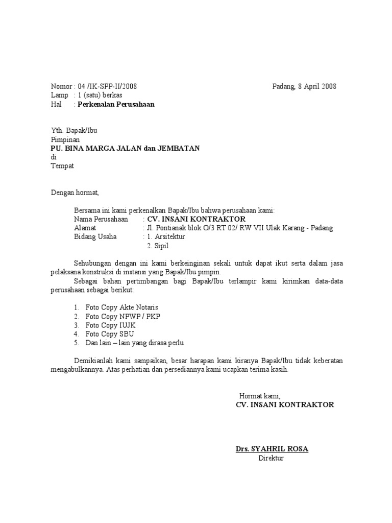 Contoh surat dan format penulisannya yang benar surat perkenalan perusahan merupakan sebuah surat resmi yang dibuat untuk memberikan informasi mengenai produk barang dan jasa yang ingin ditawarkan kepada perusahaan lainnya sehingga ia mau menjadi rekan kerja. 15 contoh surat perkenalan produk dan jasa perusahaan seiring dengan kemajuan zaman dan kecanggihan teknologi sekarang ini pihak perusahaan memang sangat mudah untuk memperkenalkan perusahaan mereka maupun produk yang mereka miliki. Banyak perusahaan perusahaan besar yang dengan mudah memperkenalkan diri maupun memperkenalkan produk ke pihak lain yakni dengan cara memasang iklan.