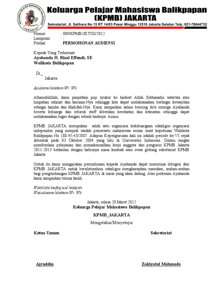 Wb hormat kami mengetahui pengurus cabang pergerakan mahasiswa islam indonesia sukabumi jawa barat. Surat audiensi ini memang dirasa perlu untuk keperluan melakukan permohonan pertemuan yang bisa berupa diskusi silahturahmi rapat dan sebagainya kepada pihak pihak yang terlibat dalam pertemuan. Contoh surat permohonan audiensi umum yang baik dan benar dimana bagi anda yang memliki sebuah kepentingan dengan pihak lain dan ingin melakukan sebuah kerjasama dalam sebuah bisnis misalkan maka diperlukan sebuah kejelasan dan anda harus memperkenalkan maksud dan tujuan anda maka dibutalah sebuah laporan atau surat audensi ini. Mohon maaf apabila terdapat kesamaan namatempatinformasi lain karena surat yang dibuat hanya bertujuan sebagai percontohan tanpa ada maksud apapun. Itulah beberapa contoh surat audiensi secara resmi dan benar perlu kalian ketahui bahwa setiap format surat tersebut bisa saja berbeda dan tidak sama tergantung isi dan instansi yang mengajukannya. Demikianlah surat permohonan audiensi ini kami buat besar harapan kami bapak dapat mengabulkan permohonan kami.