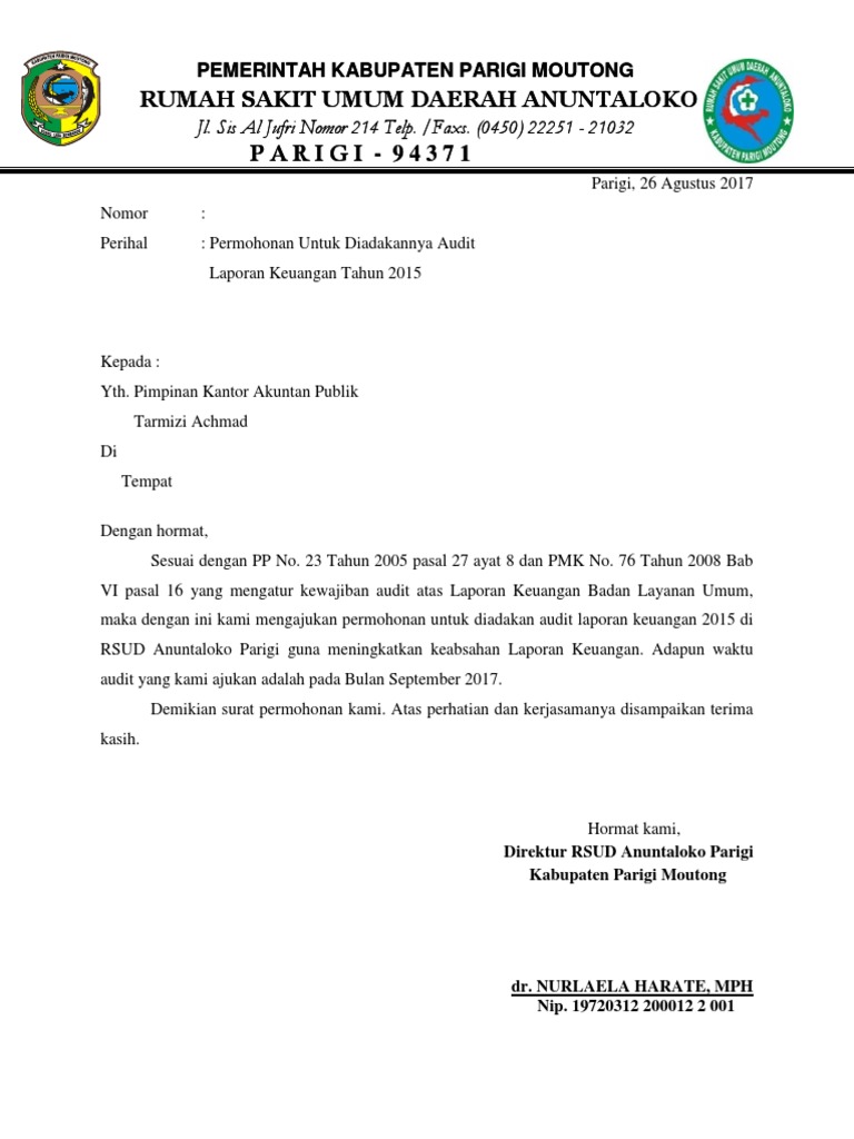 Permohonan untuk diadakannya audit laporan keuangan tahun 2015. Rumah sakit umum daerah anuntaloko jl. Bukti tersebut adalah berupa surat penunjukan untuk menjalankan tugas tertentu. Berikut salah satu contoh draf konsep permohonan audit investigasi ke hadapan pengadilan negeri oleh pemegang saham minoritas suatu perseroan terbatas dengan alasan laporan keuangan tahunan perseroan tidak akuntabel serta tidak menggunakan standar akutansi yang terstandard. Pemerintah kabupaten parigi moutong. Dengan hormat sesuai dengan pp no.