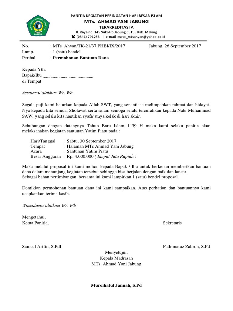 Contoh surat permohonan bantuan maulid. Demikian surat permohonan ini kami sampaikan atas perhatian dan kerjasamanya kami ucapkan terima kaish. Contoh surat undangan acara peringatan maulud nabi surat undangan acara peringatan maulid nabi merupakan surat yang dibuat untuk mengundang dalam acara peringatan nabi muhammad seperti yang kita ketahui bersama maulid nabi merupakan peringatan lahirnya nabi muhammad sawyang biasa diperingati setiap tanggal 12 rabiul awal. Contoh proposal permohonan bantuan dana masjid. Proposal phbi maulid nabipdf. Dari beberapa contoh surat di atas terlihat bahwa surat permohonan bantuan dana harus disertai kop surat dan tanda tangan pihak yang bersangkutan. Karena surat ini termasuk surat resmi maka harus memiliki kop surat kepala surat isi surat pentup surat hingga beberapa tanda tangan pihak2 yang membuat dan mengetahui surat ini.
