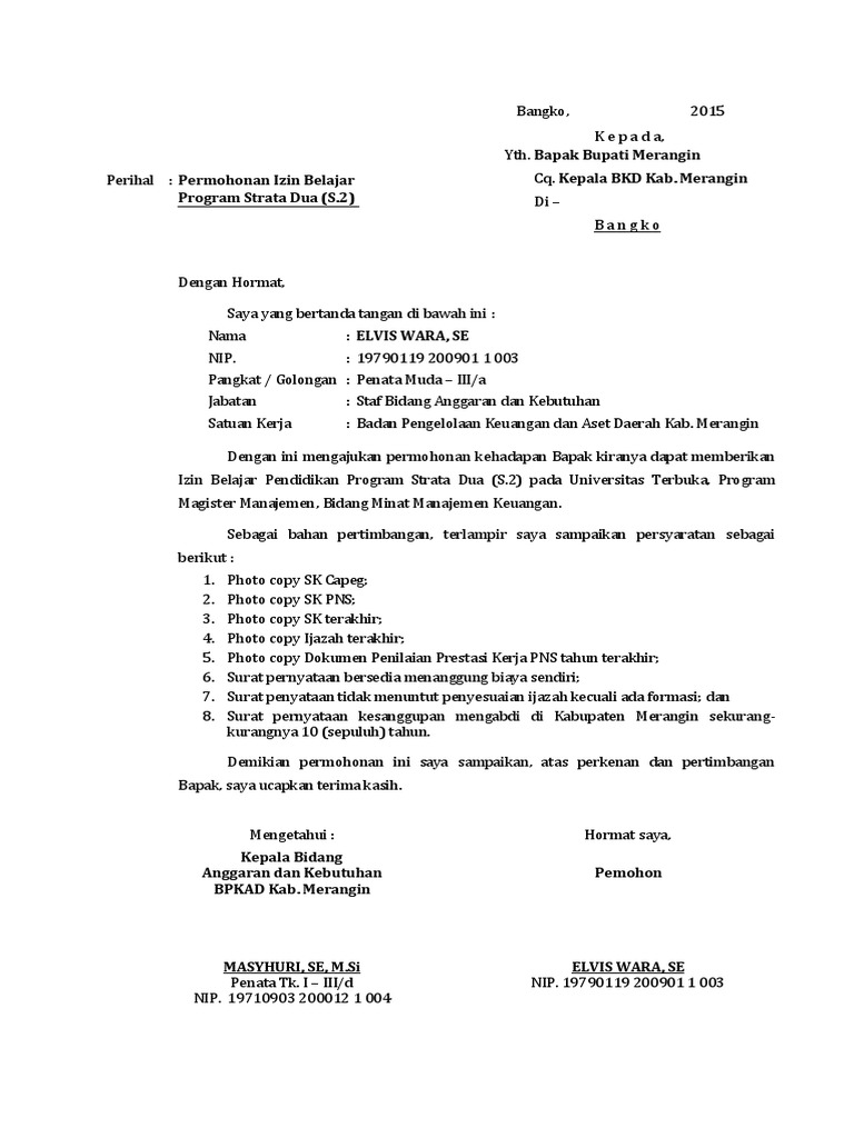 Contoh surat permohonan izin belajar. Contoh berkas permohonan izin belajar bagi pnsgttptt lengkap surat izin belajar merupakan surat yang diajukan oleh seorang pnsgttptt yang sudah bekerja pada sebuah instansi pemerintah ke dinas pendidikan atau ke instansi atasan langsung untuk memohon izin melaksanakan atau melanjutkan kuliah. The collection that comprising chosen picture and the best among others. Bapakibu yang akan atau sedang mengikuti pendidikan dalam jabatan atau melanjutkan studi sambil bekerja. Contoh surat permohonan izin lanjut kuliah have an image from the othercontoh surat permohonan izin lanjut kuliah it also will feature a picture of a sort that might be seen in the gallery of contoh surat permohonan izin lanjut kuliah. Contoh surat lengkap surat ijin surat lamaran kerja perintah resmi permohonan keterangan undangan dinas niaga jalan dukungan pengantar. Melanjutkan surat permohonan ijin belajar an slamet mugiyono nip.