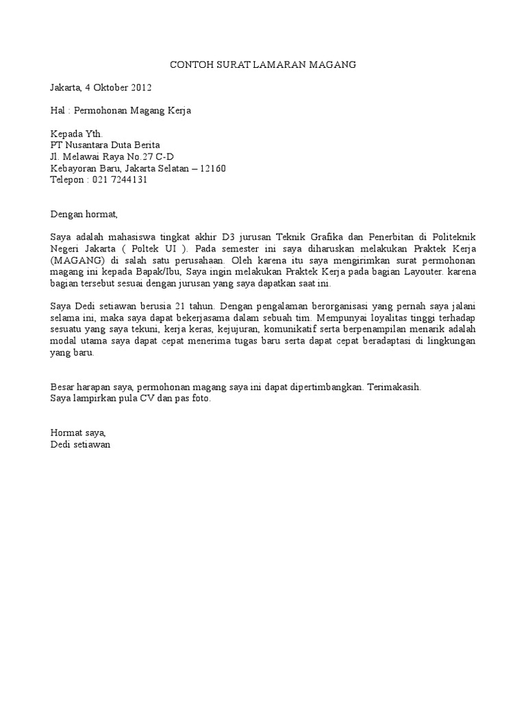 Contoh surat permohonan magang kerja sudah tidak asing dengan surat permohonan magang kerja kan. Maju terus pantang mundur jalan mataram 123 sleman yogyakarta. Contoh surat permohonan magang kerja perusahaan. Poin pertama yang harus dicantumkan dalam surat permohonan magang kerja yang baik dan benar ini adalah menyebutkan pihak instansi yang dituju lengkap dengan alamatnya. Pada umumnya para mahasiswa tingkat akhir harus menyelesaikan kerja magang terlebih dahulu sebelum menamatkan atau menyelesaikan pendidikan dari universitas tertentu ataupun dari kampus tertentu. Surat permohonan magang kerja yang baik dan benar.